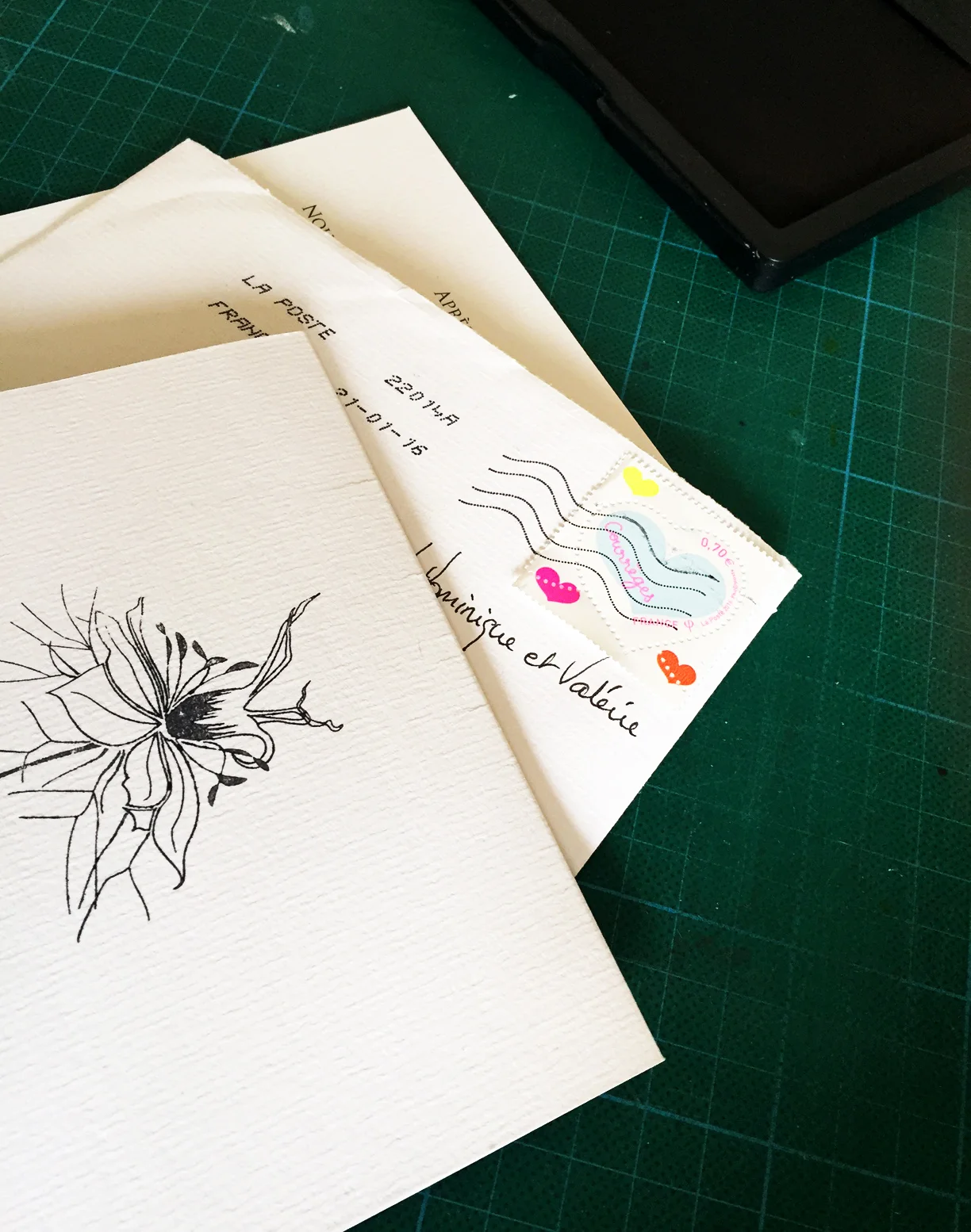 Cette invitation de mariage a été inspirée par la fleur préférée de la mariée, la Nigella Damascena. Un logo minimaliste et élégant a été créé pour convenir à l'occasion. Les invitations et menus ont été imprimés sur du papier de coton et estampillés à la main. Timbre fait à la main sur du papier personnalisé.